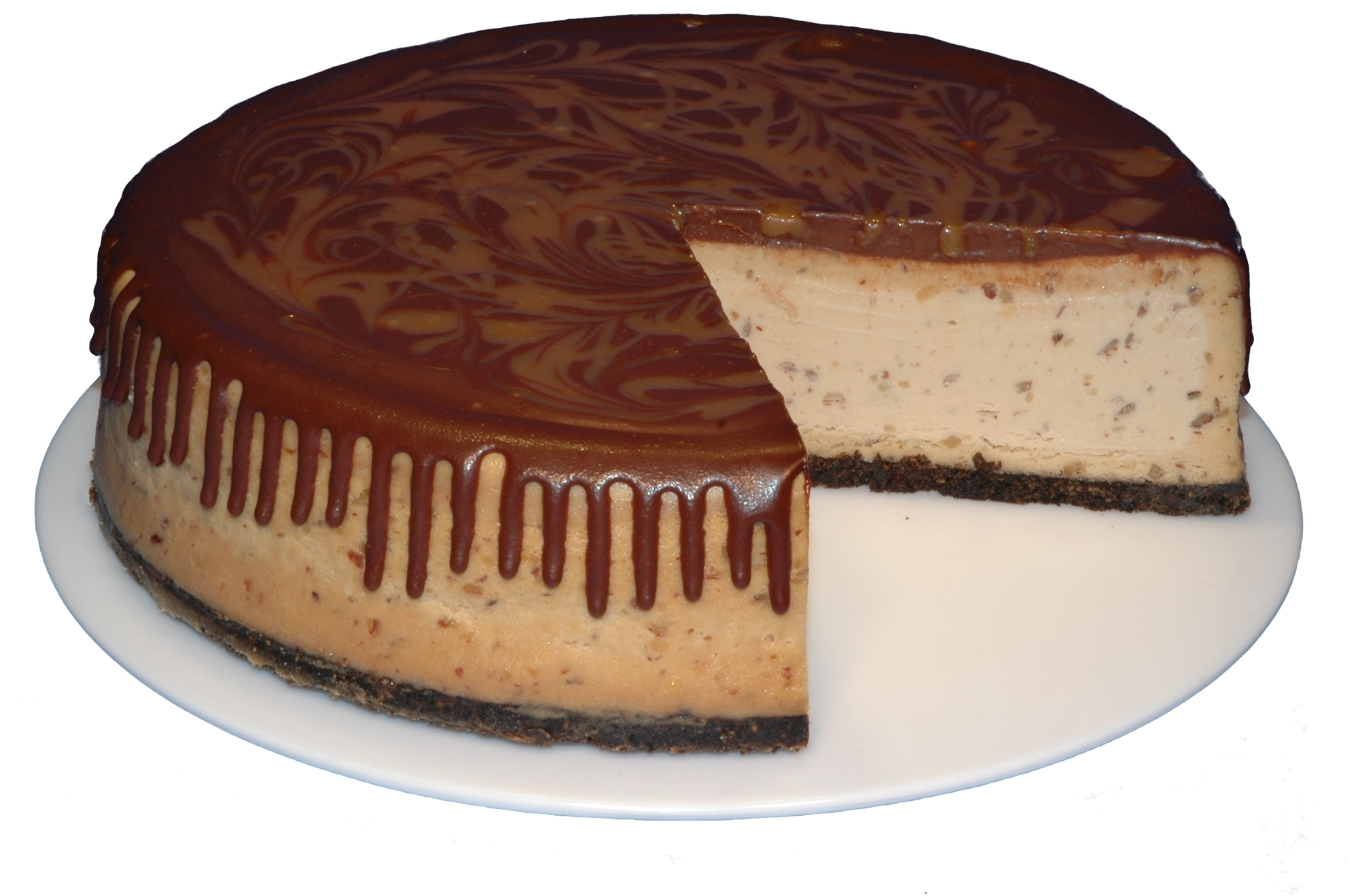 Our ALMOND CAPPUCCINO is made with finely ground toasted almonds, white chocolate, cappuccino & almond extract. It is baked on a chocolate cookie crust & topped with chocolate swirled with caramel.